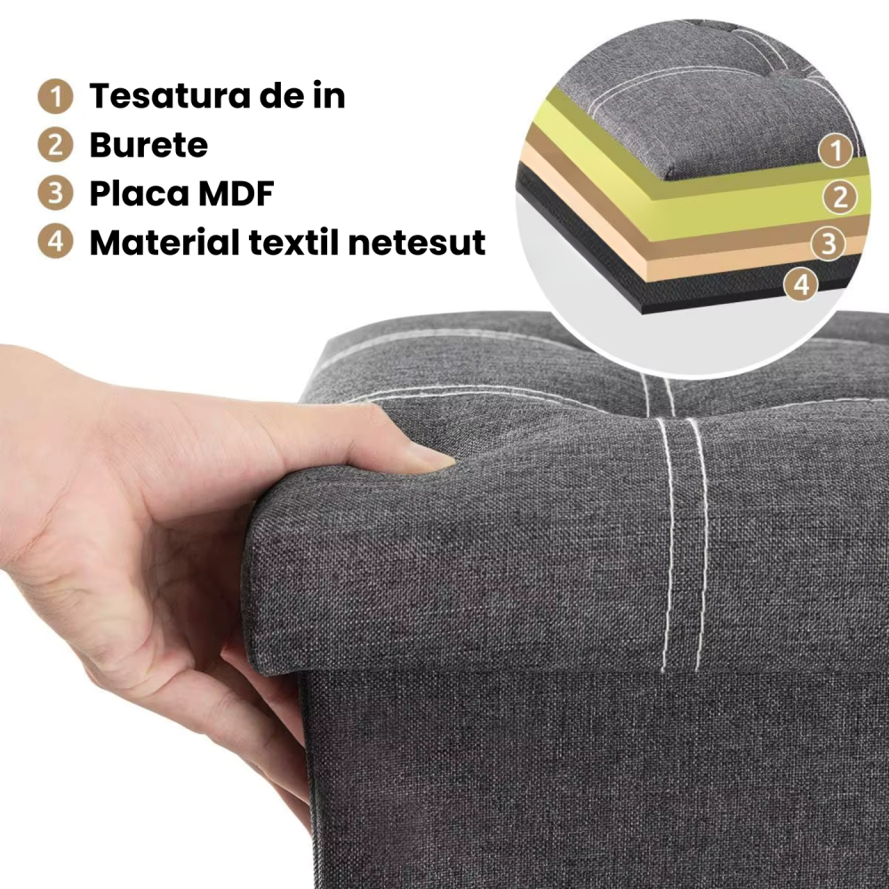 Inainte de orice, satisfactia si confortul tau sunt pe primul loc. Construit cu atentie la detalii si cu scopul de a aduce un plus de functionalitate caminului tau, acest taburet otoman reprezinta combinatia ideala intre aspect, durabilitate si accesibilitate. Iti doresti o ambianta moderna si primitoare in locuinta? Aceasta piesa de mobilier poate fi solutia potrivita, adaugand un aer sofisticat si practic oricarei incaperi. In plus, il poti depozita usor atunci cand nu ai nevoie de el, multumita formei sale compacte. ✅
