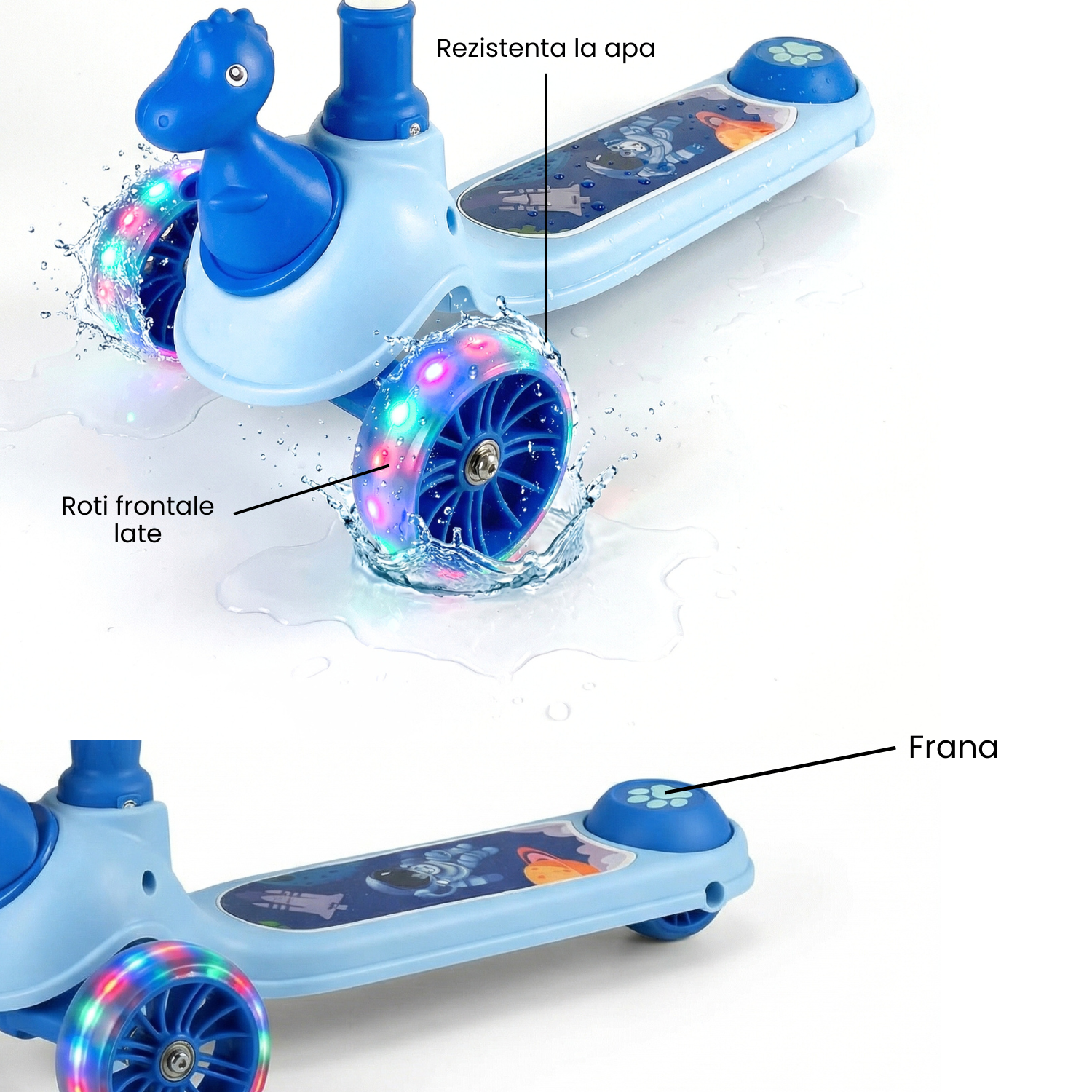 Construita din materiale rezistente si gandita pentru utilizare zilnica, trotineta este echipata cu roti frontale late (diametru 10.5 cm) care asigura stabilitate si aderenta optima pe diverse suprafete.