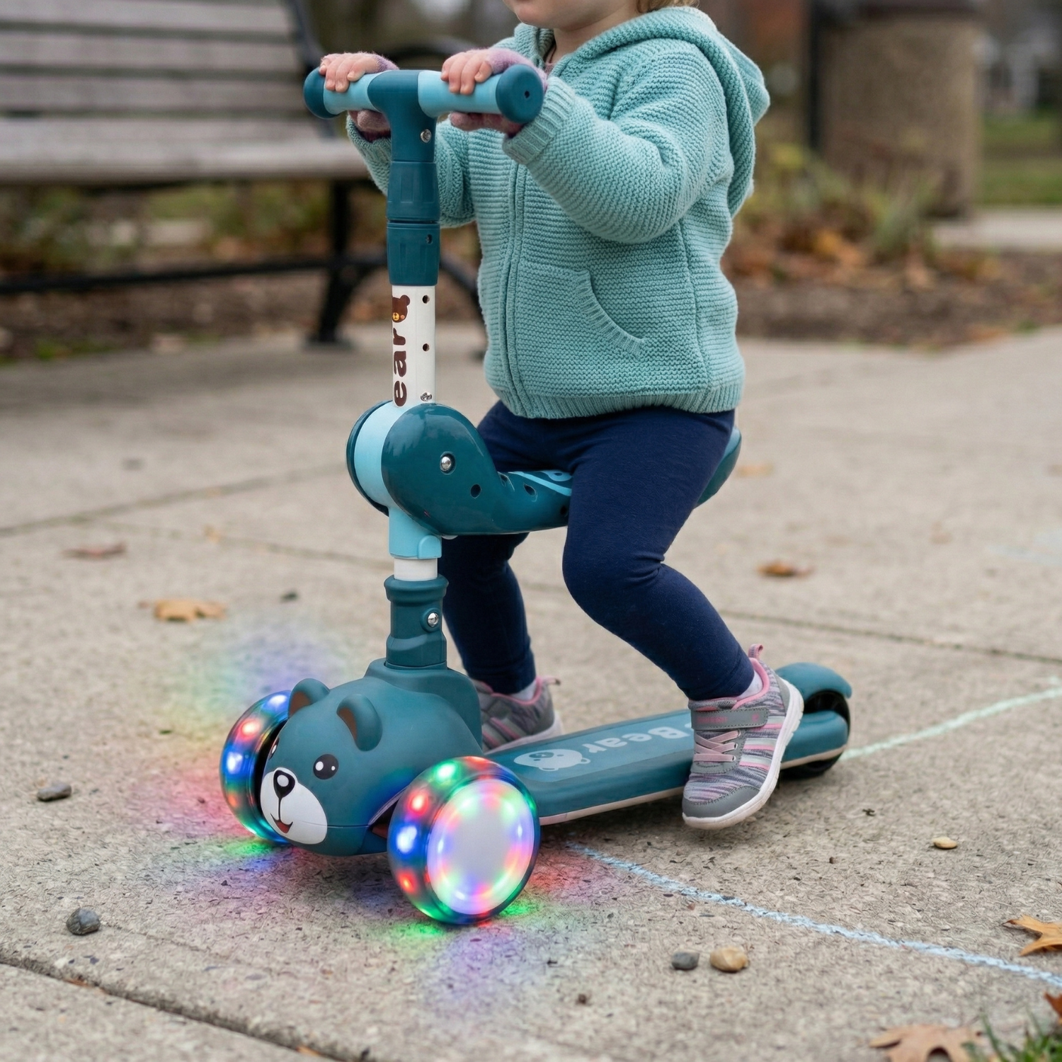 OEM Trotineta pentru Copii  2 in 1  cu Sezut, Roti cu Lumini LED, de la 3 ani, Sistem Ghidon cu Inclinare, Ajustabil 60.5 - 67.5 cm, Model ursulet, Albastra