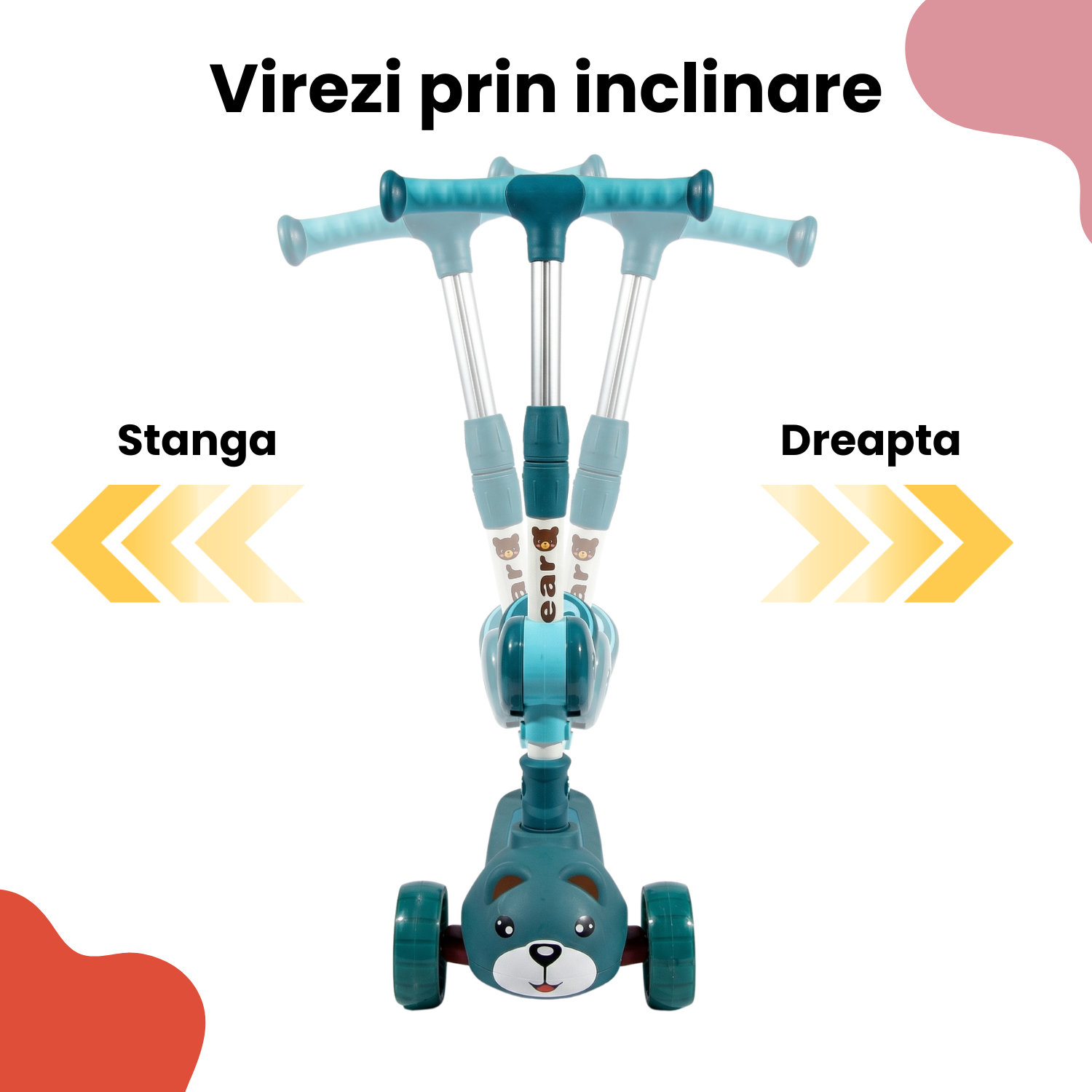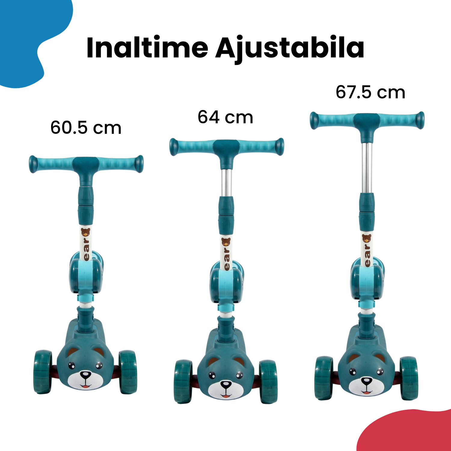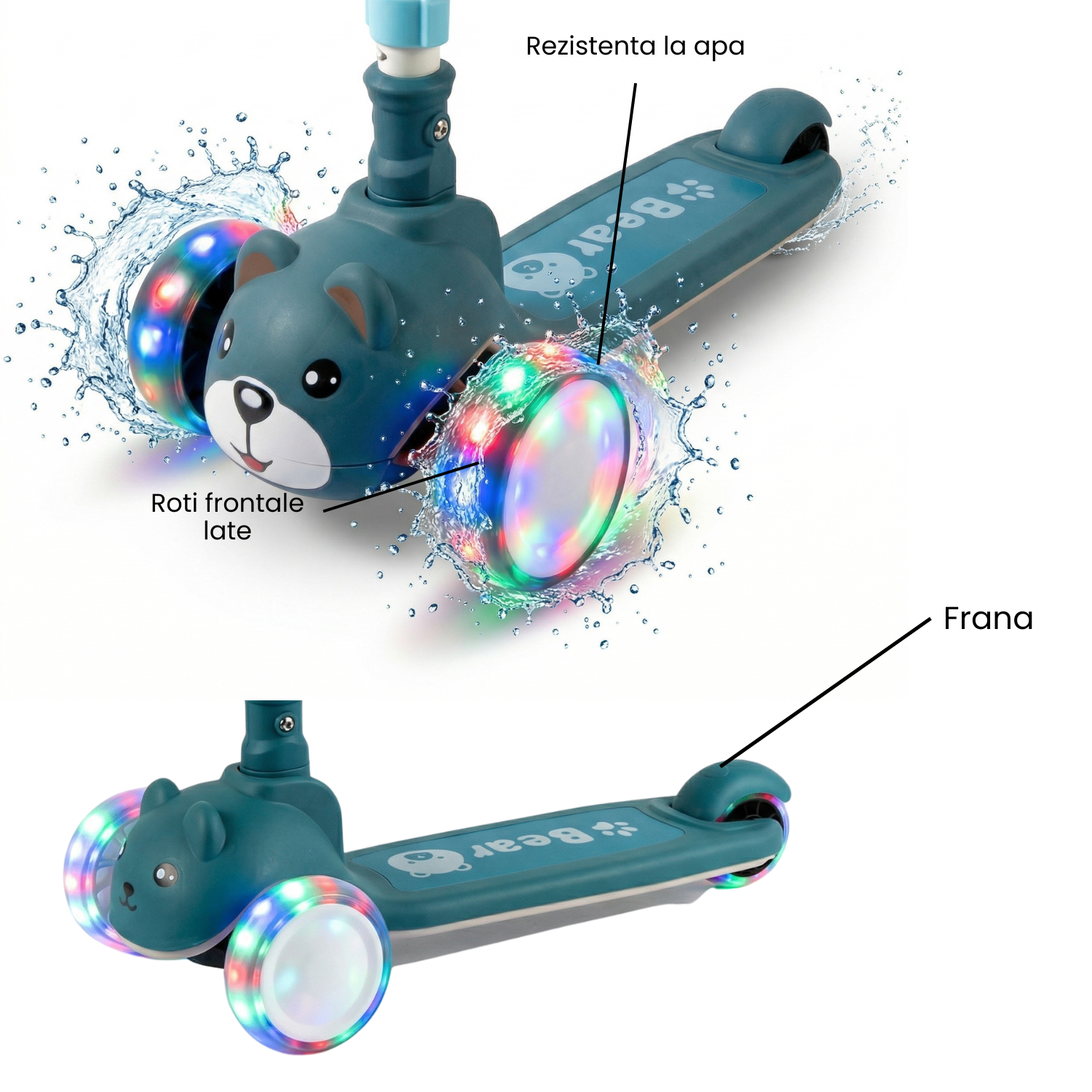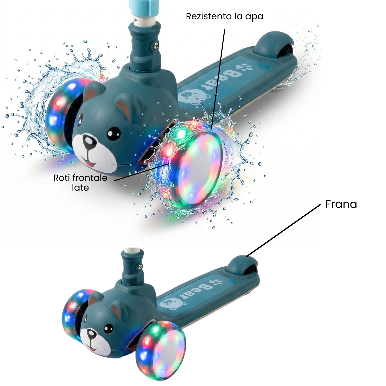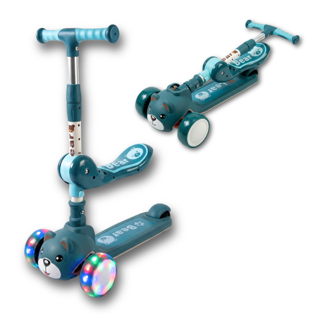 Ofera-i copilului tau o experienta distractiva si sigura cu aceasta trotineta pentru copii cu 3 roti, special conceputa pentru stabilitate, confort si distractie maxima! Designul adorabil cu ursulet si rotile LED colorate transforma fiecare plimbare intr-o aventura plina de lumina si voie buna. ✨
