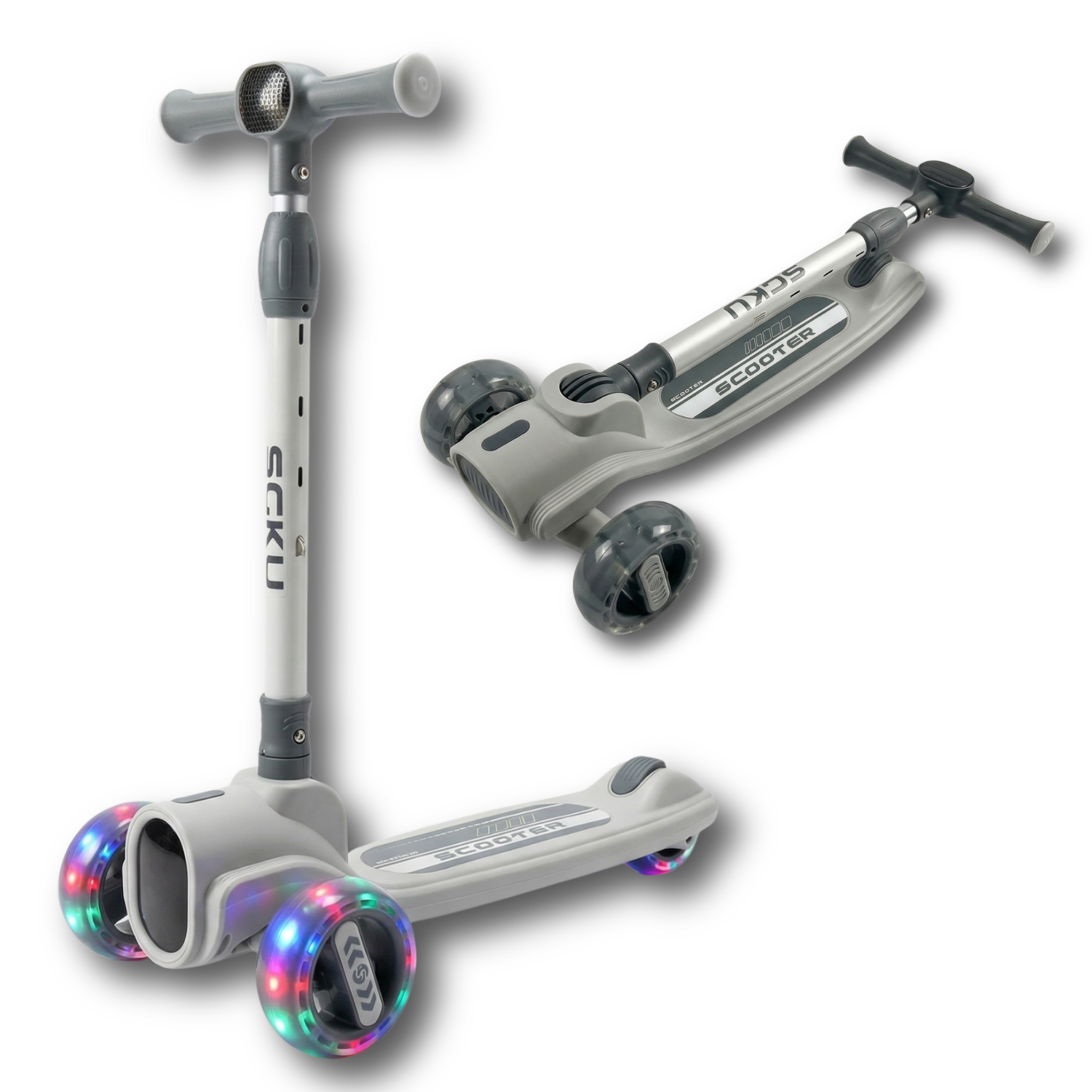 Trotineta Copii, 3+ Ani, Paliabila, Roti Luminoase si Muzica Lumini, Roti Late, Suprafata Antiderapanta, Frana, Inaltime Ghidon Reglabil 66-82 cm, Ghidon cu Inclinare, Gri