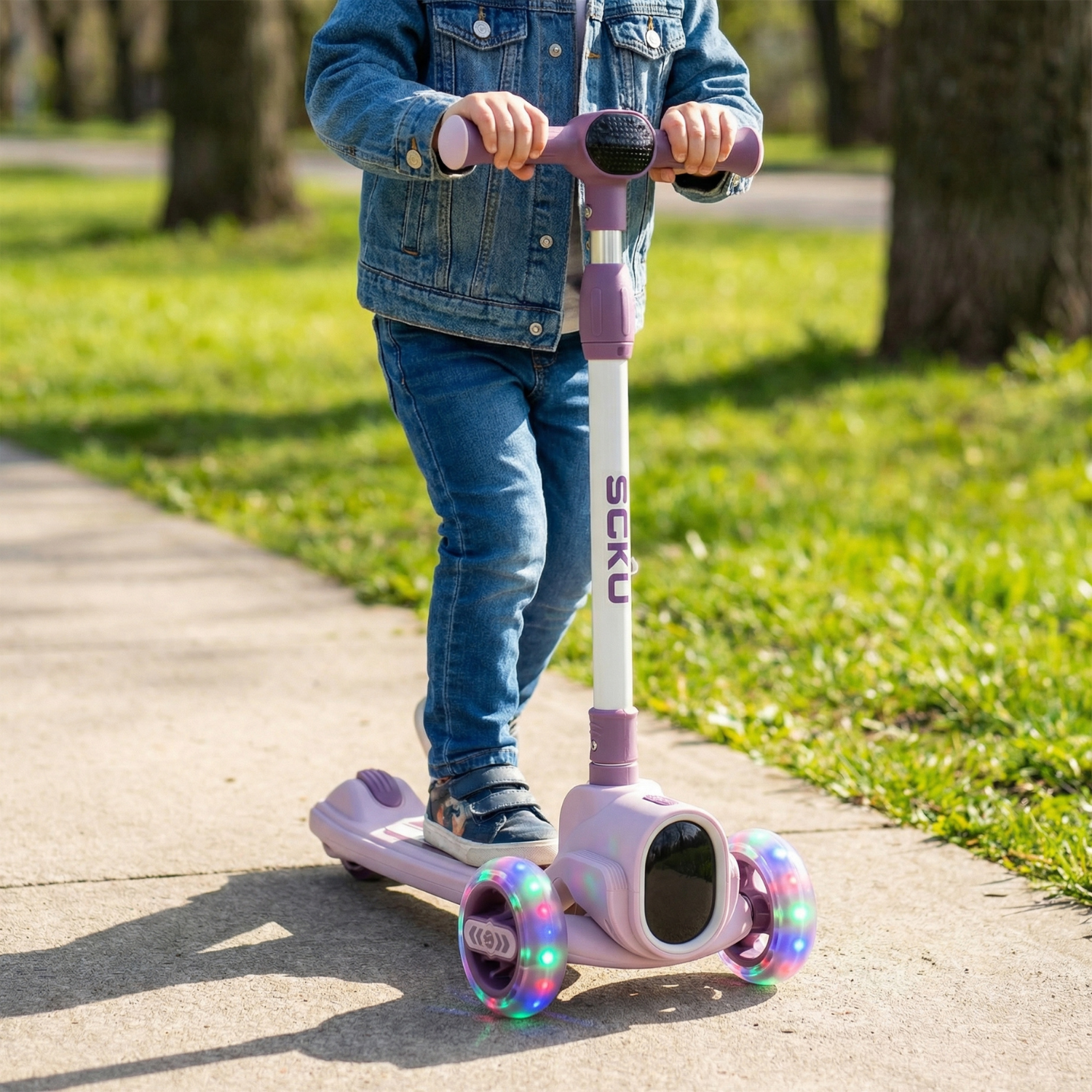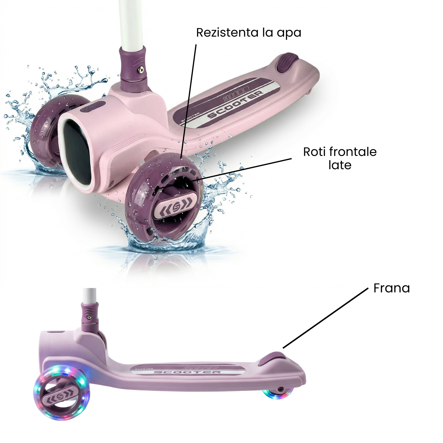 Culoarea mov moderna, combinata cu rotile LED luminoase si efectele de muzica si lumini, transforma fiecare plimbare intr-o aventura captivanta. Copiii vor adora sa se deplaseze cu stil, iar parintii vor aprecia vizibilitatea sporita.