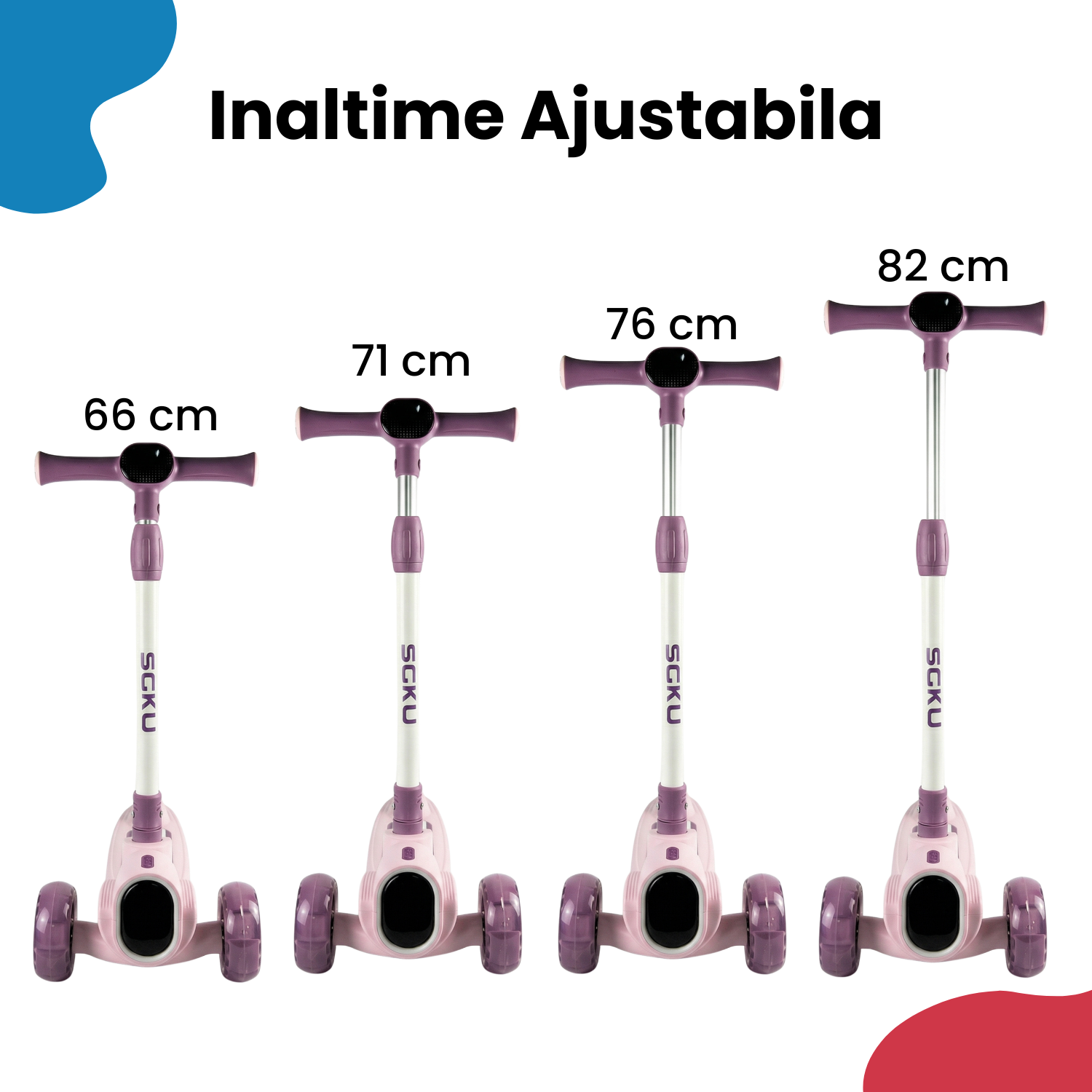 Ghidonul reglabil pe 4 nivele (66 cm, 71 cm, 76 cm, 82 cm) permite utilizarea pe termen lung, adaptandu-se perfect inaltimii copilului. Manerele ergonomice asigura o prindere confortabila si sigura.