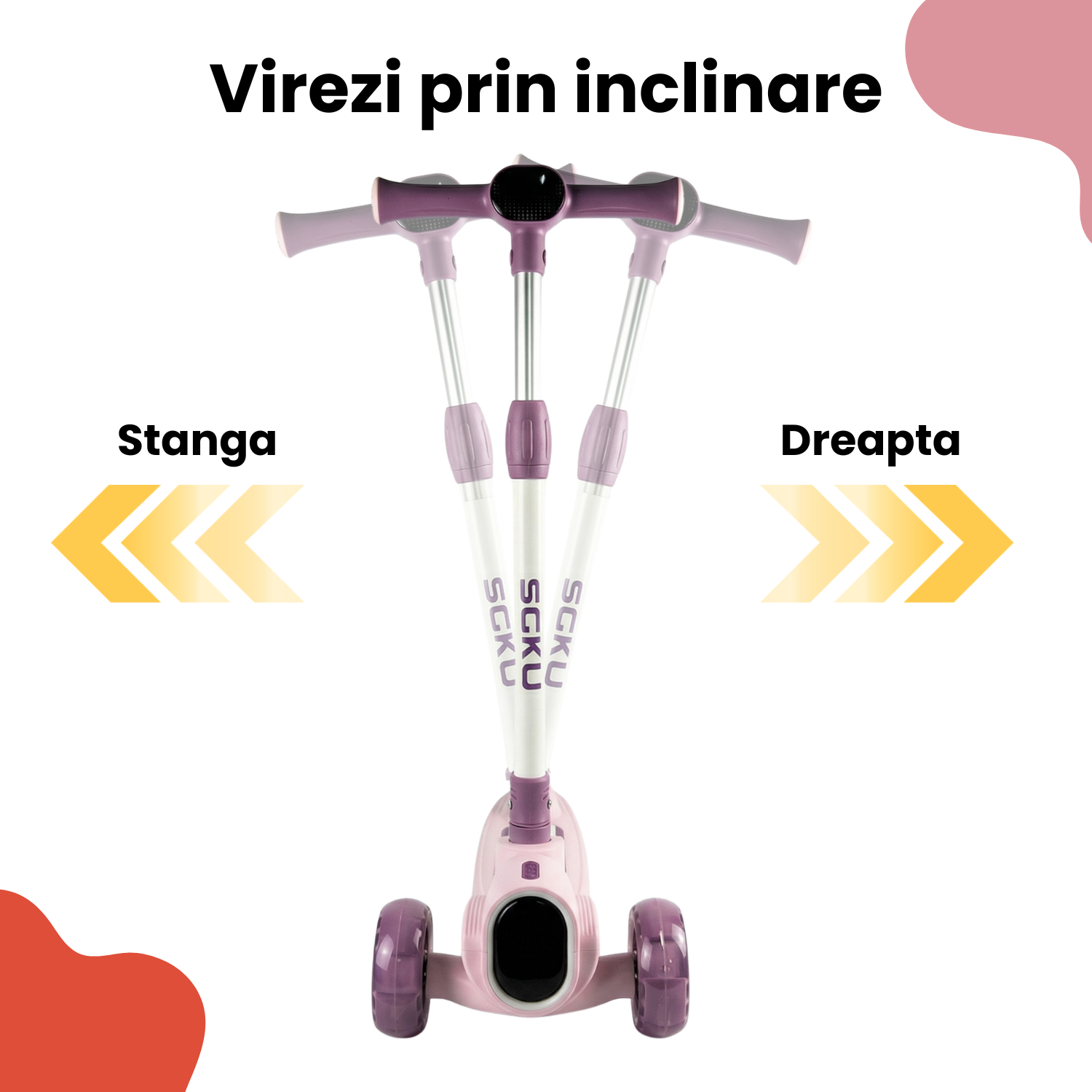 Datorita celor 3 roti late, trotineta ofera echilibru excelent, fiind perfecta pentru incepatori. Sistemul de virare prin inclinare ajuta copilul sa controleze directia in mod natural, fara miscari bruste.