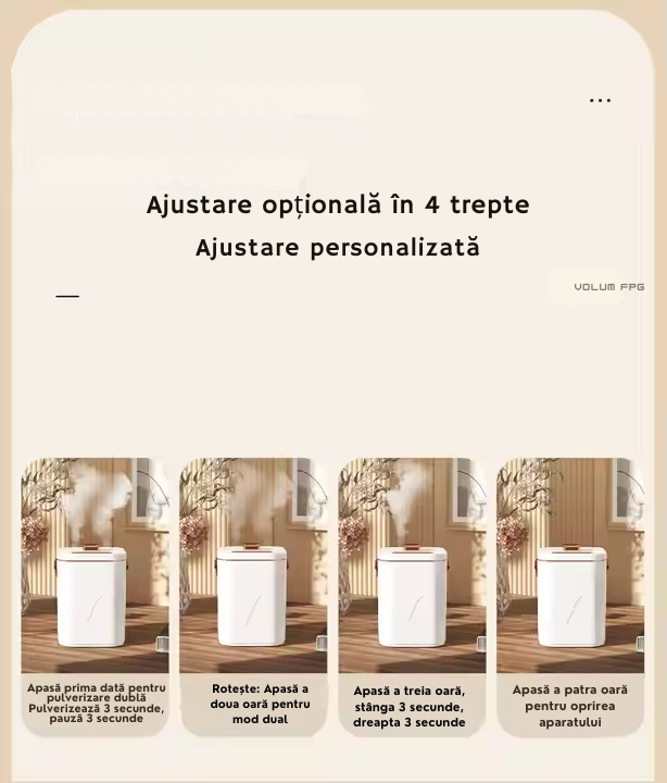 Pentru un control si mai mare asupra nivelului de umiditate, acest umidificator dispune de 4 trepte de reglare a pulverizarii. Poti porni pulverizarea dubla cu pauza intermitenta, pulverizarea simultana pe ambele duze pentru un efect intens, sau pulverizarea secventiala stanga-dreapta. Daca vrei doar sa mentii un nivel constant de umiditate, exista si un mod in care umidificatorul alterneaza intre stanga si dreapta, oferind un flux echilibrat de ceata. Cu o simpla apasare a butonului de control, alegi modul de lucru preferat, iar cu inca o apasare poti opri rapid aparatul.